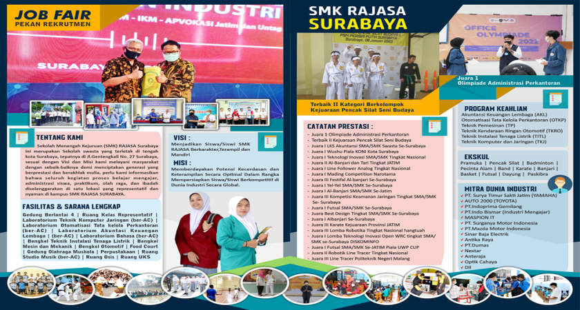 Terkait informasi PPDB SMKS RAJASA TP 2023-2024 sudah dapat dilakukan, untuk informasi lebih lengkapnya silahkan datang ke Alamat: JL. Genteng Kali No. 27 Surabaya, atau hubungi kami di: (031)-5344810.